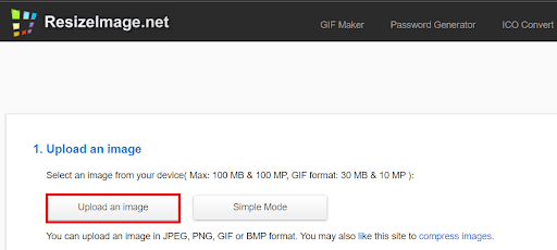 - Klik tombol Upload an Image dan pilih foto mana yang ingin Anda kecilkan.