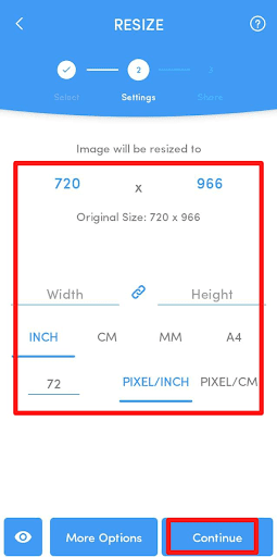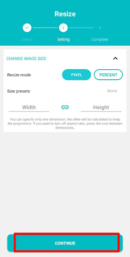 - Atur ukuran foto yang Anda inginkan menggunakan cara Pixel/Percent > klik tombol Continue pada bagian bawah dan secara otomatis foto Anda akan tersimpan di galeri.