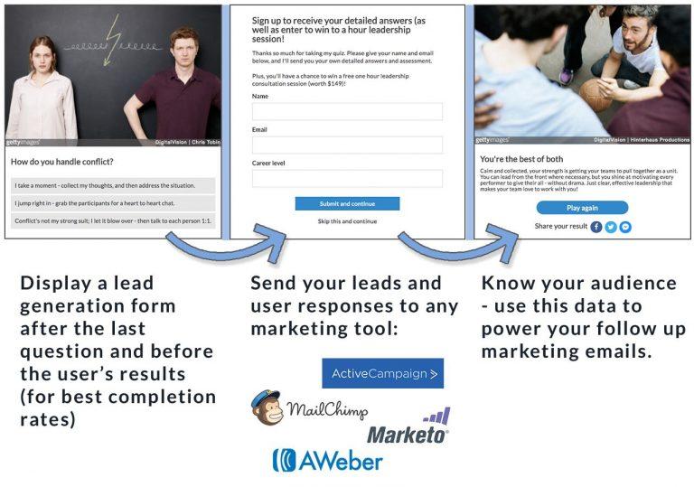 Misalnya, di akhir kuis, Anda dapat meminta pengguna memasukkan email mereka untuk mengirim hasil kuis. Kemudian Anda dapat menghubungkan Riddle dengan layanan pemasaran email Anda untuk secara otomatis mengekspor prospek pendaftar ke daftar email Anda.