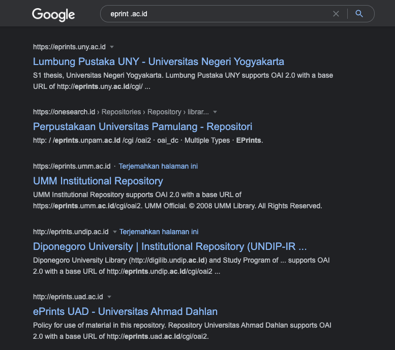 Langkah untuk menemukan alamat website yang menggunakan EPrints adalah dengan mengetikkan kata kunci “eprint .ac.id”, seperti pada gambar berikut: