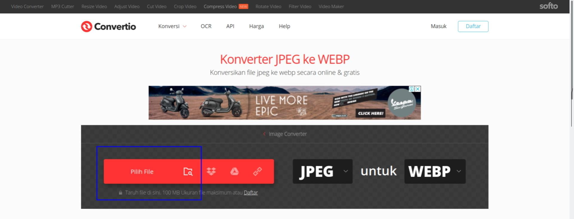 2. Buka file JPG yang ingin dikonversi, dengan cara mengklik tombol Pilih File.