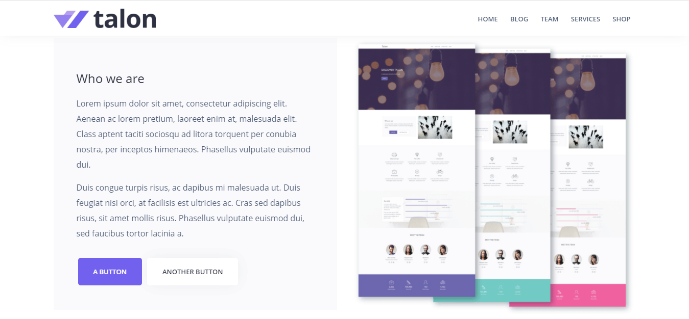 Talon adalah salah satu tema bisnis serbaguna. Pada bagian Header, Anda bisa memilih, apakah ingin berupa slider, gambar statis, ataupun menghilangkannya. Hal itu bisa Anda lakukan dengan begitu mudah.